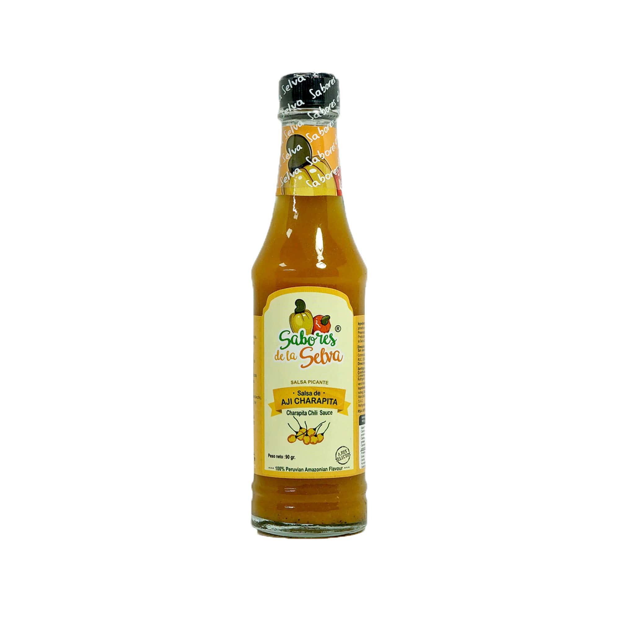 Salsa líquida elaborada con ají charapita amazónico, agua, vinagre, sal y especias naturales. Su textura ligeramente densa y color amarillo vibrante reflejan la intensidad de su sabor picante. No contiene saborizantes ni colorantes artificiales.